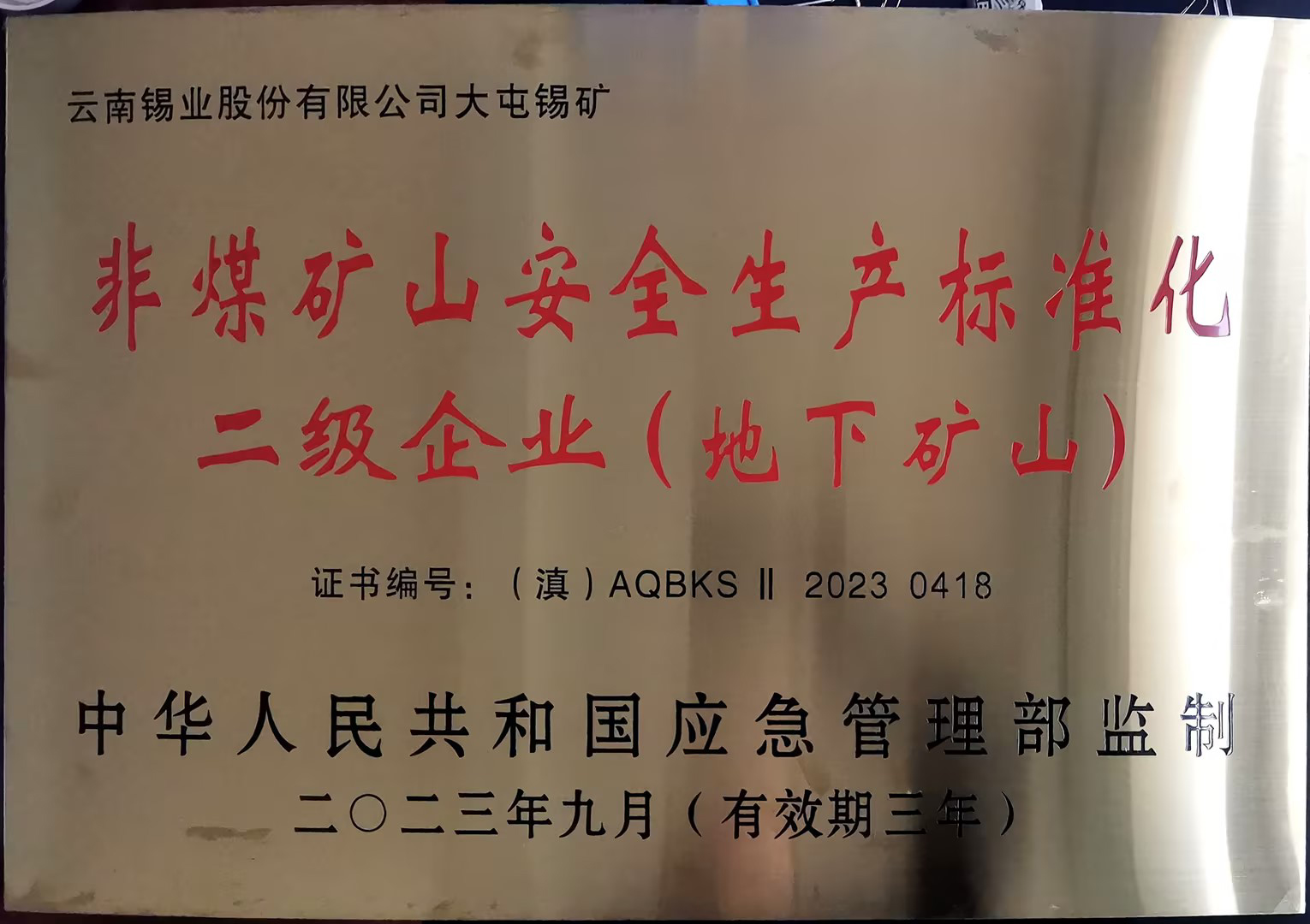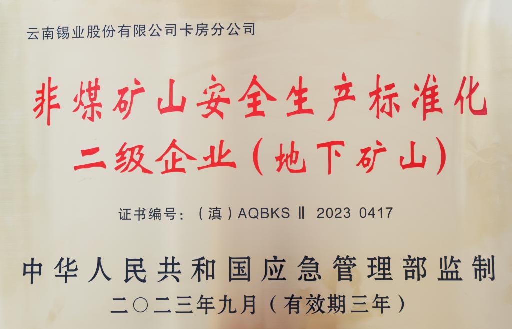 近日,錫業股份卡房分公司、大屯錫礦兩家單位收到由中華人民共和國應急管理局監制、云南省應急管理廳頒發的牌匾和證書,正式確認為“非煤礦山安全生產標準化二級企業”,為今后持續穩定發展打下良好基礎。